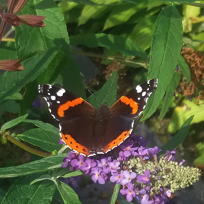 Vasemmalla harvinainen etelänpäiväkiitäjä syyssyrikan (Buddleja) kukinnolla, oikealla amiraali
