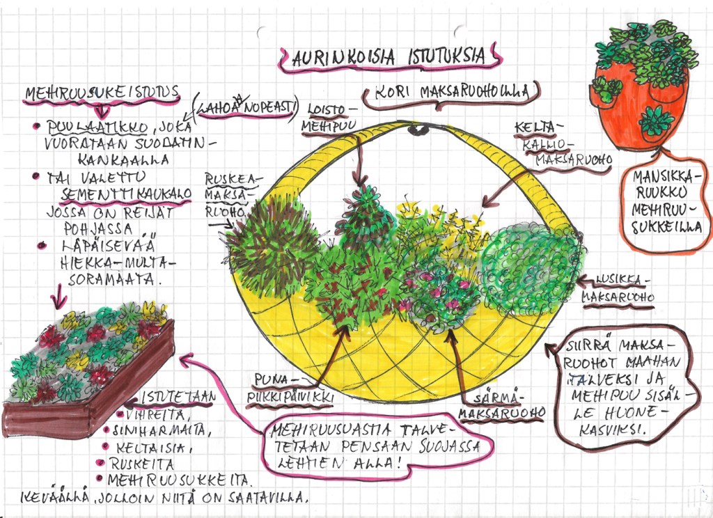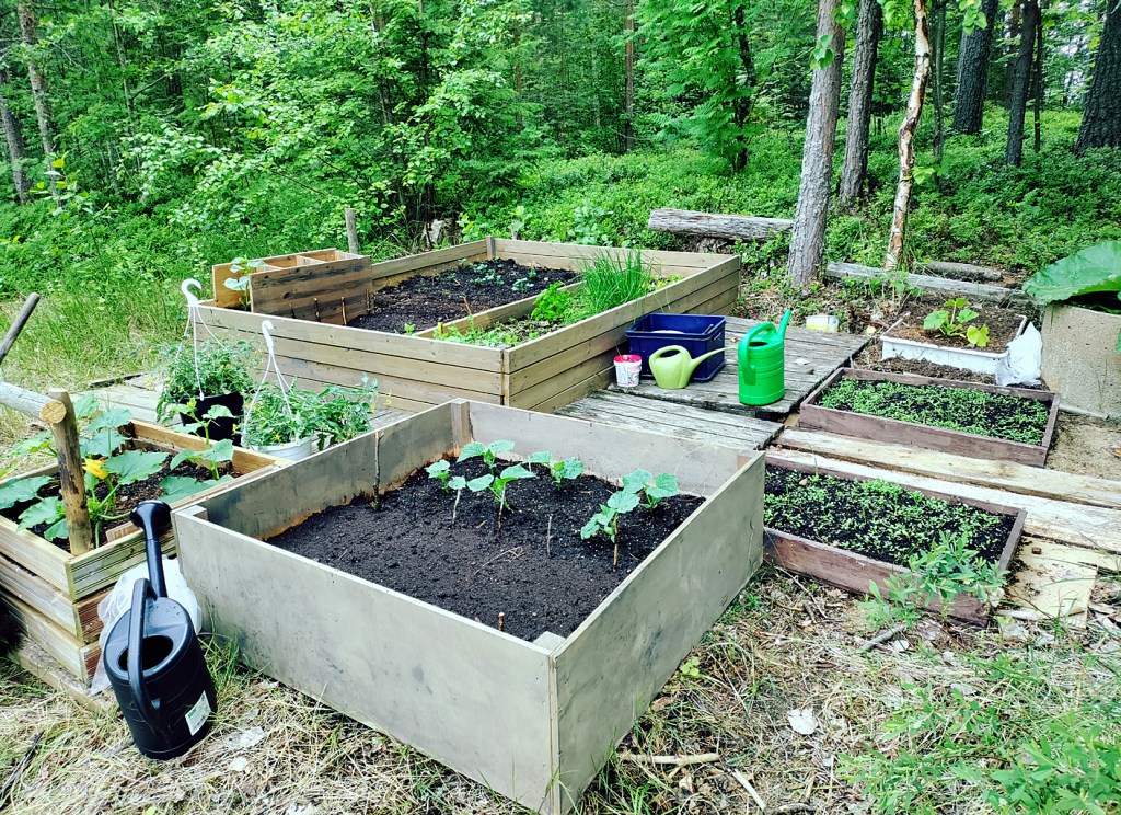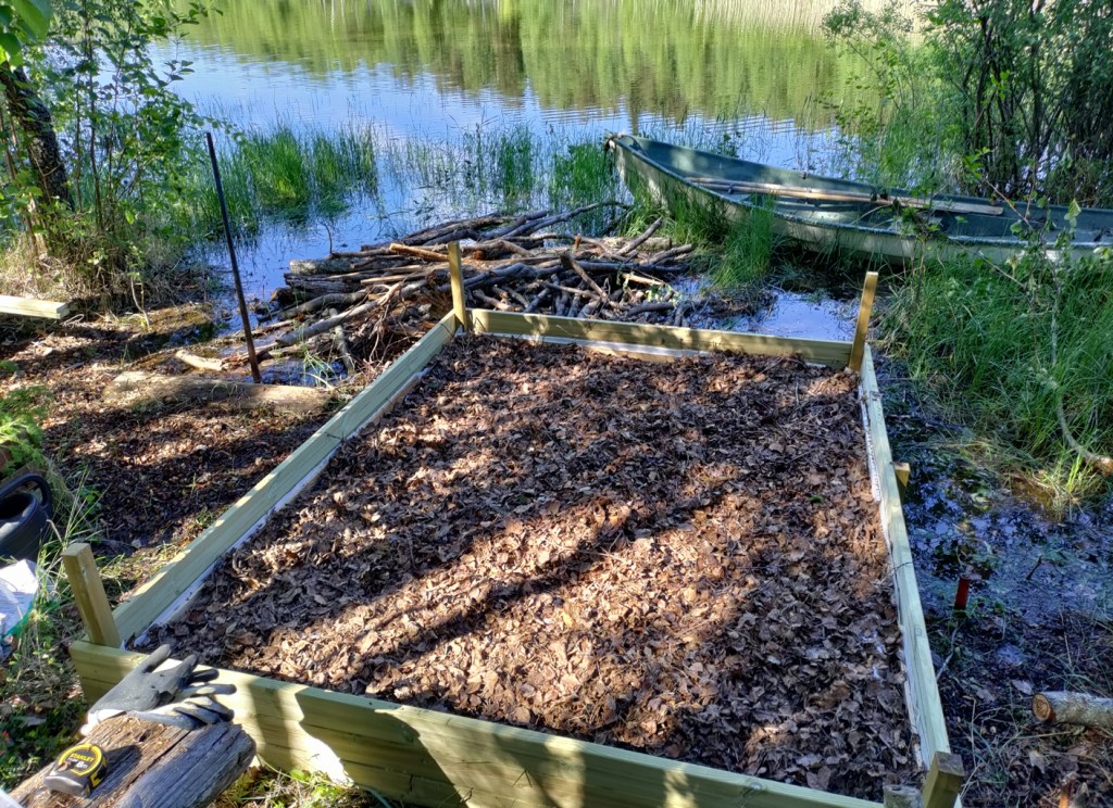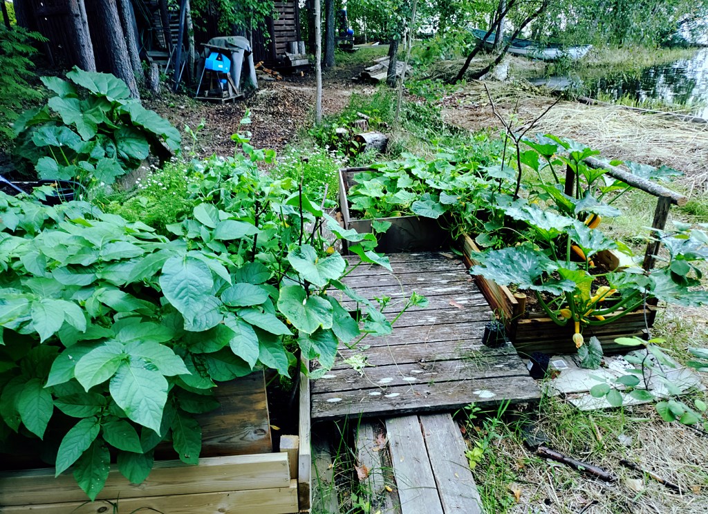 Kuvasarja eräältä laatikkoviljelmältä Kerimäellä. Aivan rannan tuntumaan, saraa kasvavalle vesijättömaalle on alkukesällä alettu rakentaa pientä kesämökin hyötypuutarhaa. Lautakehikoiden pohjalle on ensiksi laitettu sanomalehtia ja pahvia, sitten risuja ja vanhaa lahovikaista puutavaraa sekä päälle lehtikompostia. Päällimmäisenä on 10 – 20 cm kerros puutarhamultaa. Syntyneille pikkupalstoille on kylvetty ja istutettu valikoitujen hyötykasvien siemeniä ja taimia.