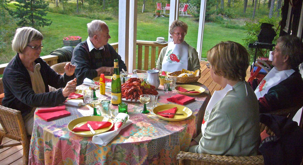 Perinteiset rapujuhlat mökillä elokuussa 2008 (Kikko, Mara, Ulla, Kari ja Leena). Juhlat alkoivat jo vuonna 1968 Ullan toimesta. Kollegat Juni ja Kaarina ovat olleet mukana sen jälkeen, kun Mara kuoli 2011. Elokuisena perjantaina 2023 söimme jälleen rapuja ja lauloimme juomalauluja, nyt Leenan luona.