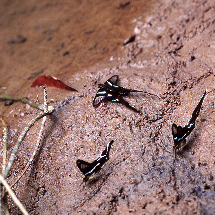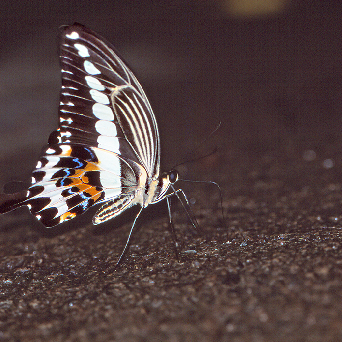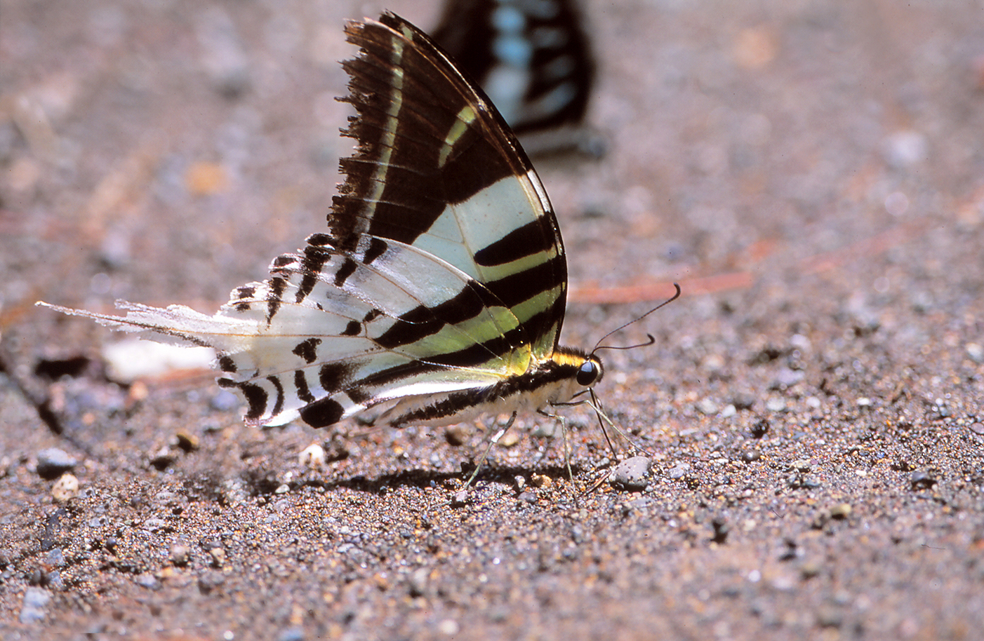 Pariin kymmeneen vuoteen ei ole havaintoja, mutta nyt Wallacen perhonen on nenän edessä! En uskalla hievahtaakaan. Perhonen on kulunut ja siivet ripsaantuneet, mutta giganttisen Graphiumin voimakkaan kaarevat etusiivet, vihertävä juovitus ja pitkät, sulavat kannukset eivät jätä epäilylle sijaa. Se nostaa siivet pystyyn ja työntää imutorven syvälle hiekkaan. Hivuttaudun maahan kuvausasentoon ja kädet vapisten saan tarkennettua ja laukaistua. Ryömin mahallani vielä lähemmäksi ja saan perhosen hievahtamattomaan tähtäimeen. Nikonin suljin losahtaa korvissani kuin pommi, mutta imemiseen keskittynyt ja Bantimurungin pauhun turruttama perhonen ei hätkähdä. Äkkinäinen liike kimmottaisi sen takuulla tiehensä. Henkäisen syvään, kävipä munkki.