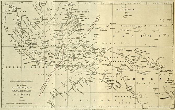 Karttaan on piirretty Wallacen linja, joka kulkee Indonesian saariston poikki erottaen toisistaan intialaisen ja australialaisen eliömaantieteellisen alueen (Wallace AR. On the Physical Geography of the Malay Archipelago. Journal of the Royal Geographical Society 1863; 33: 217-234).