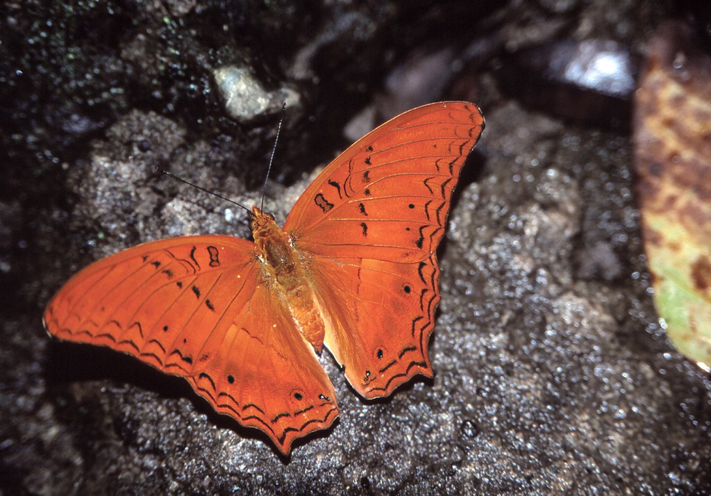 Kävelen putouksen yläosassa pikkujärveksi levinneen suvannon reunamilla. Siitä pääsee loikkaamaan hiekkasärkälle, jossa on keskellä matalaa kalliolouhosta. Yhtäkkiä iso vaalea perhonen putoaa särkän kosteaan kohtaan, jossa jo kyttäämäni isoraitoritari (Papilio gigon) (vas.) värisyttää siipiään. Androcles (oik.)! Se on totta tosiaan jättisapeli (Graphium androcles). En ole uskoa silmiäni.