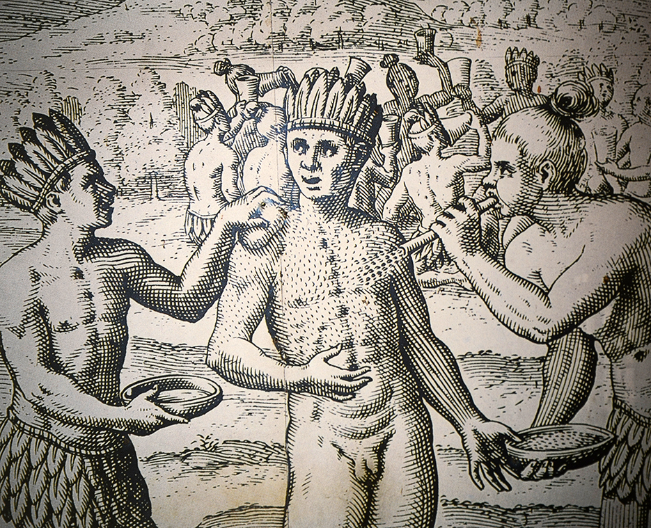 ”Nyt vasta saapui kruunattava päällikkö, kultaisista levyistä tehdyllä valtaistuimella, jota miehet kantoivat hartioillaan. Hän katsoi arvokkaasti, mutta läpitunkevasti heimolaisiaan. Rintaa peittävään kultaiseen levyyn oli upotettu smaragdeja. Kädessä oli kultainen valtikka, vallan symboli. Valtaistuimen molemmilla puolilla laahusti vanha mies. Heidän kulkunsa muistutti voimansa tunnossa olevaa päällikköä elämän lyhyydestä ja katoavaisuudesta.