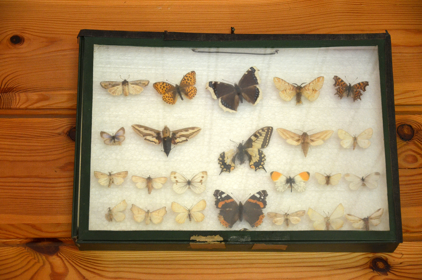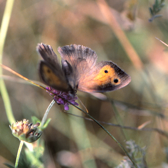 Ylhäällä Hanskin kokoelmalaatikko, jossa tuo vuoden 1964 idänhäränsilmä (Hyponephele lycaon) on vasemmassa rivissä keskimmäinen. Idänhäränsilmä on satunnainen kaakkoisessa Suomessa ja erittäin uhanalainen. Se lentelee mieluiten kuivilla hiekkadyyneillä, joilla kasvaa ajuruohoa. Koiraan, naaraan ja elinympäristön kuvat ovat eteläisestä Virosta, radanvarresta läheltä Veskin vanhaa asemaa.