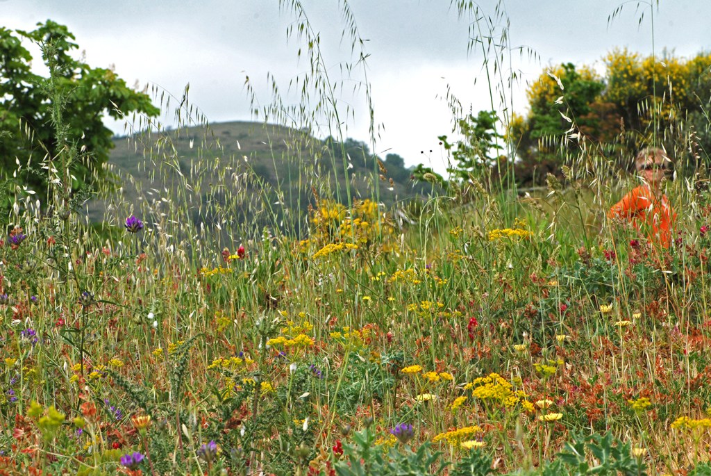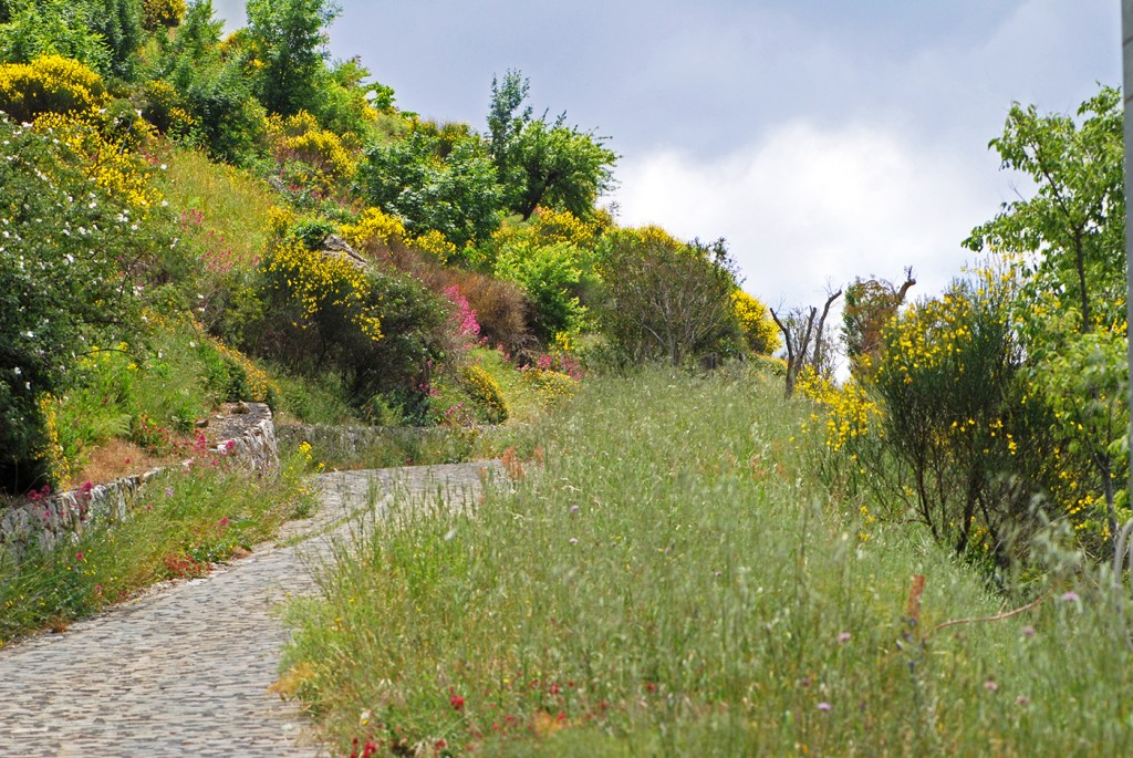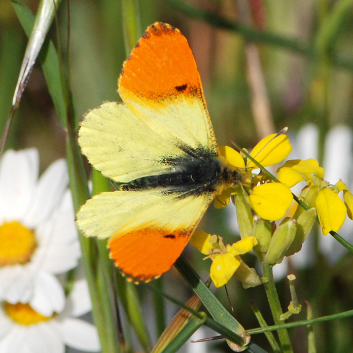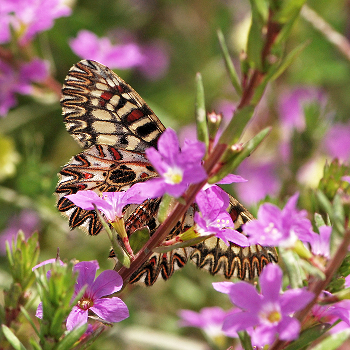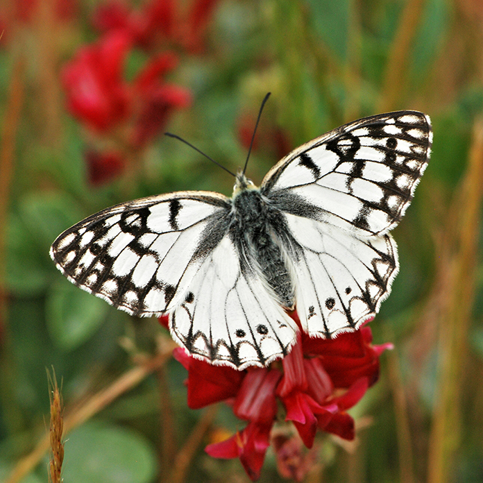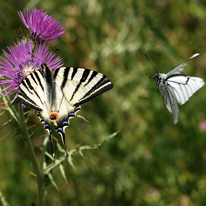 Etsimme Sisilian luoteisosista vihjeen perusteella vimmatusti sisilianruutukaista (Melanargia pherusa). Ja löytyihän se kukkulalle nousevan kivisen polun ihanilta kukkapenkereiltä! Kaverina marmorisiipi (Euchloe ausonia).