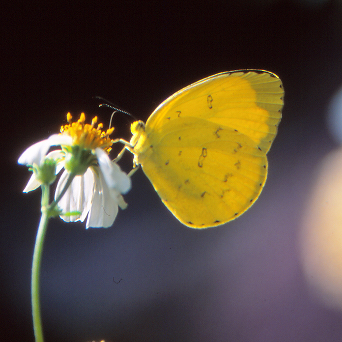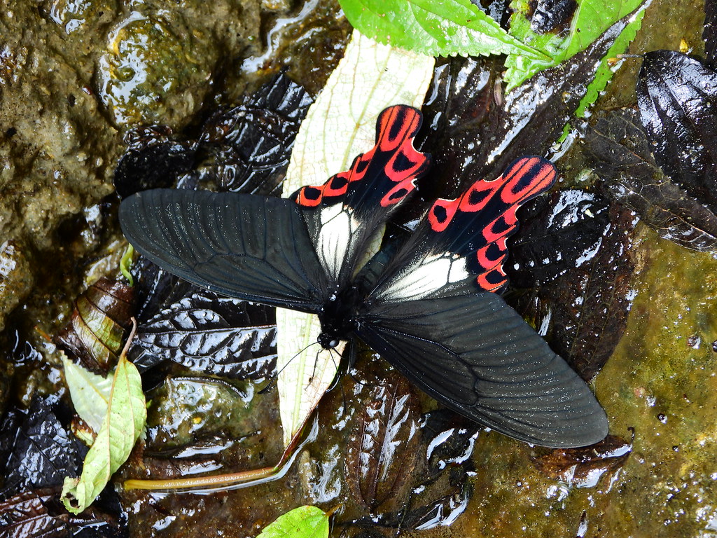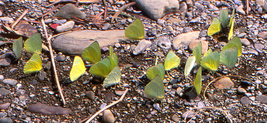 Yamingshanin kansallispuistossa ylänköseulo (Parantica sita niphonica), kylävilkko (Eurema hecabe), viuhtoja (Coliadinae) kuivahtaneen puron pohjalla, tarhaviuhto (Catopsilia pomona), tarkemmin tunnistamaton syrjö (Mycalesis sp.) ja Common Purple Saphire (ei suom. nimeä) (Heliophorus epicles).